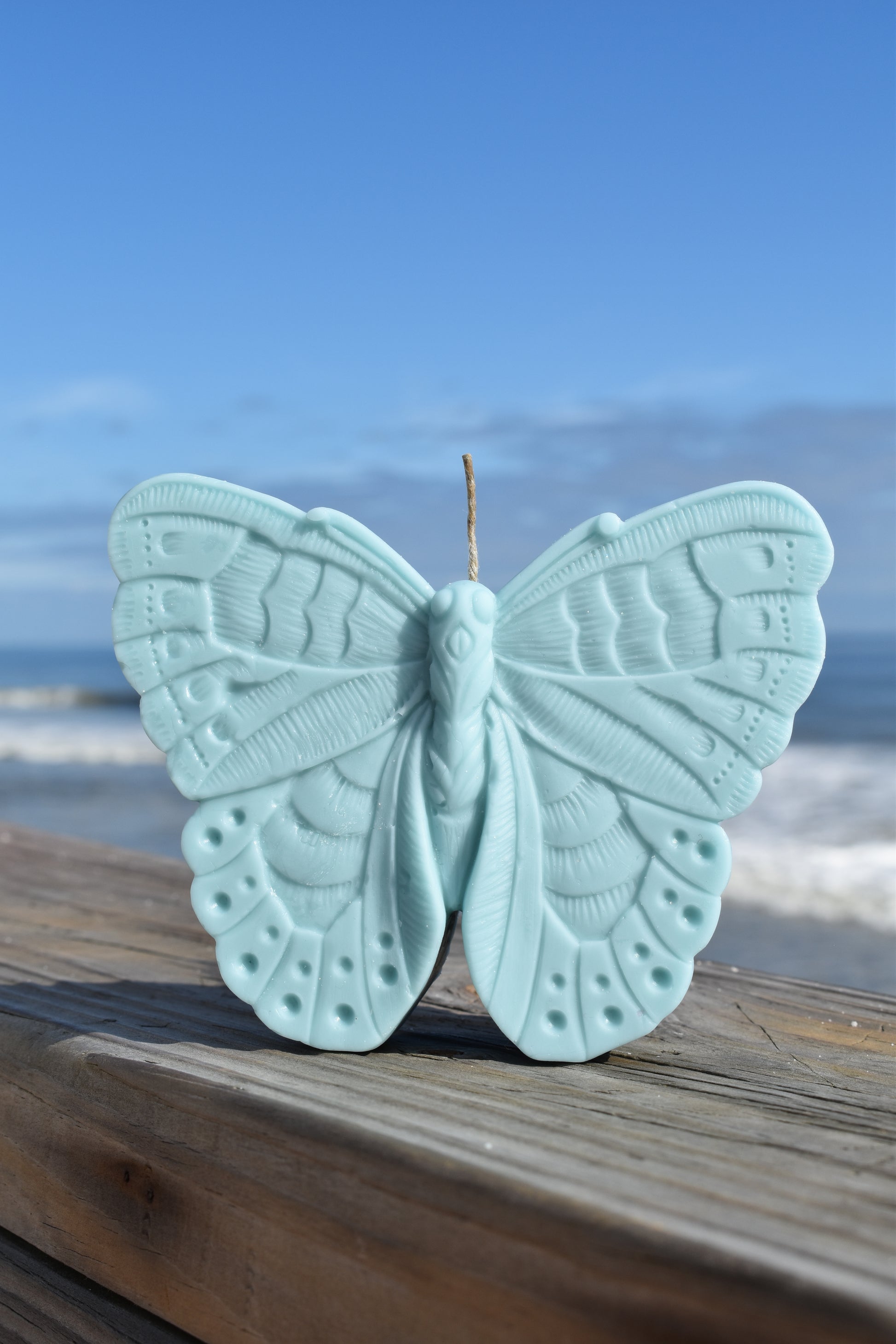 Blue Butterfly Candle: Crafted from smooth soy wax, this enchanting candle showcases a whimsical butterfly design in serene blue tones. Perfect for boho and girly aesthetics, it doubles as stunning ocean-inspired decor or a delightful table centerpiece. An ideal gift for her, blending coastal charm with a groovy vibe.
