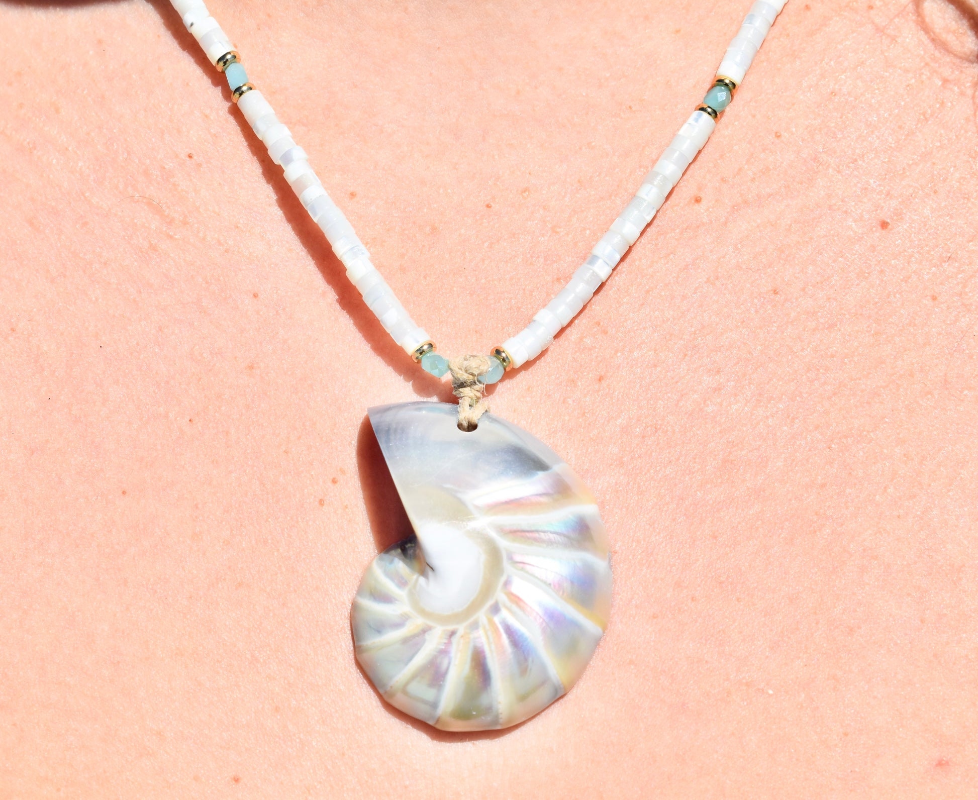 The shell hangs from a strand of mother of pearl beads, accented with delicate blue glass beads and 18k gold-plated brass spacers. The necklace is crafted on durable stainless steel wire, ensuring both strength and lasting quality. Necklace hardware is 18k plated brass.
