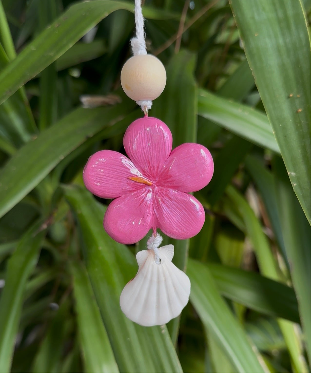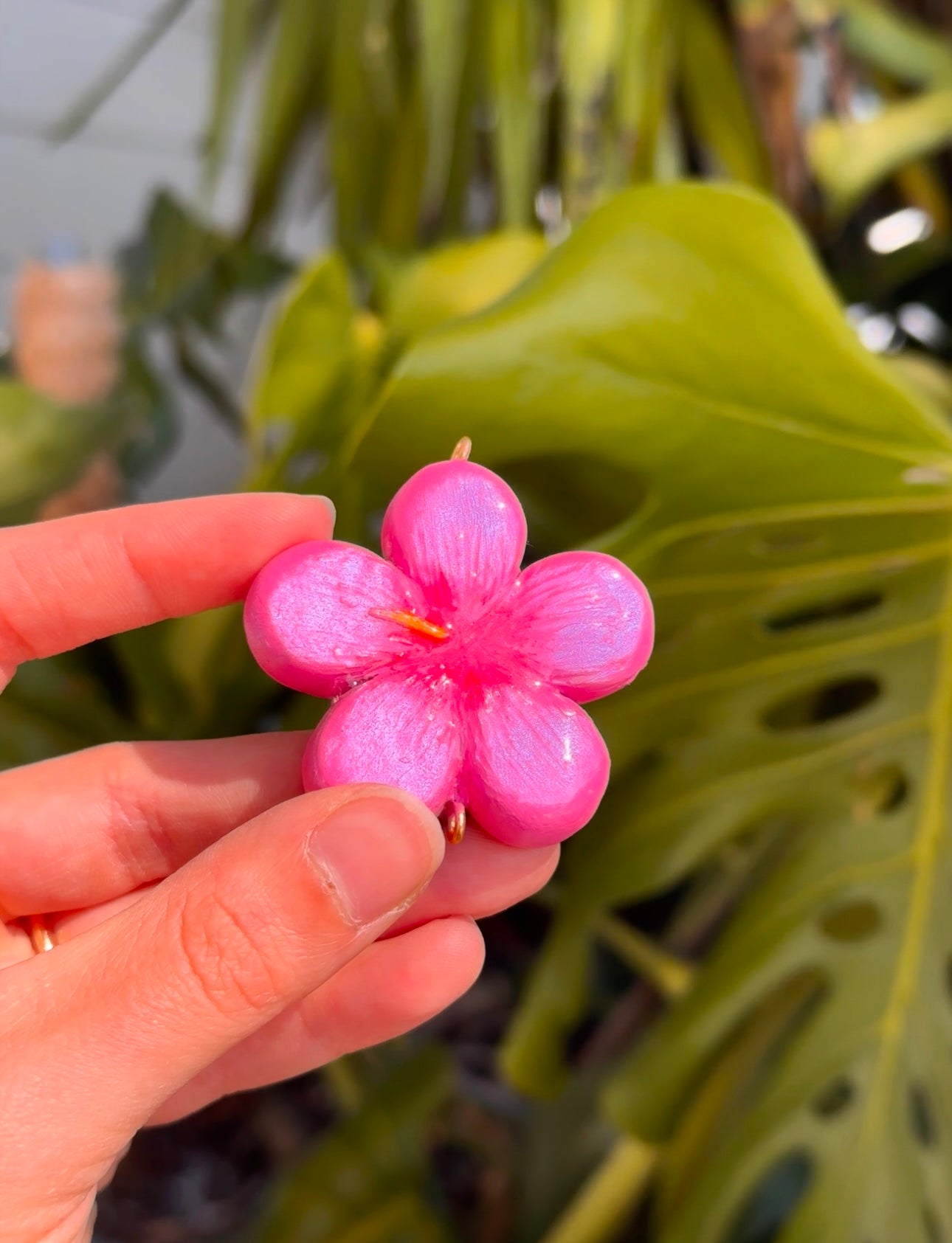 Each hibiscus is individually handcrafted, making each one unique. After being carefully molded, it is baked, hand-painted, finished with a touch of pink iridescent shimmer, then sealed for a glossy finish.
